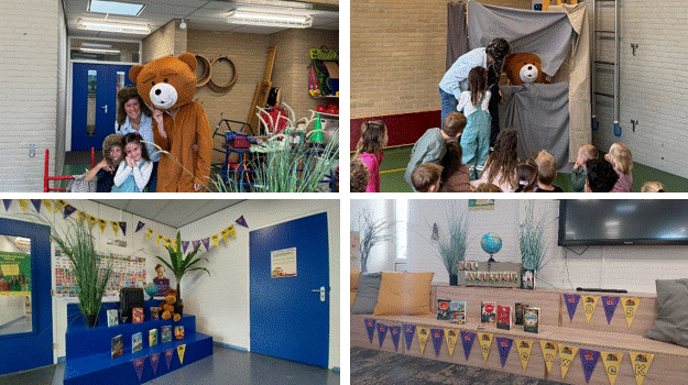 In de kleutergroepen hebben we het prentenboek We gaan op berenjacht voorgelezen in de gymzaal. En wat gebeurde er toen ? Er zat zomaar een beer in de grot! De kinderen vonden het fantastisch en hebben het verhaal daarna nog vaak nagespeeld. Ook de boekenmarkt was weer een groot succes en er zijn weer veel boeken verkocht.