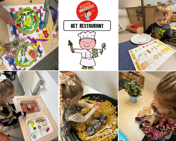 In de kleutergroepen werken we momenteel volop aan het thema restaurant. We hebben samen heerlijke soep gekookt, we spelen en tellen met pasta, we schrijven menukaarten en maken met klei de mooiste (en lekkerste) gerechten. Natuurlijk wordt ook in de hoeken druk gekookt, besteld en geserveerd. Een thema om van te smullen!