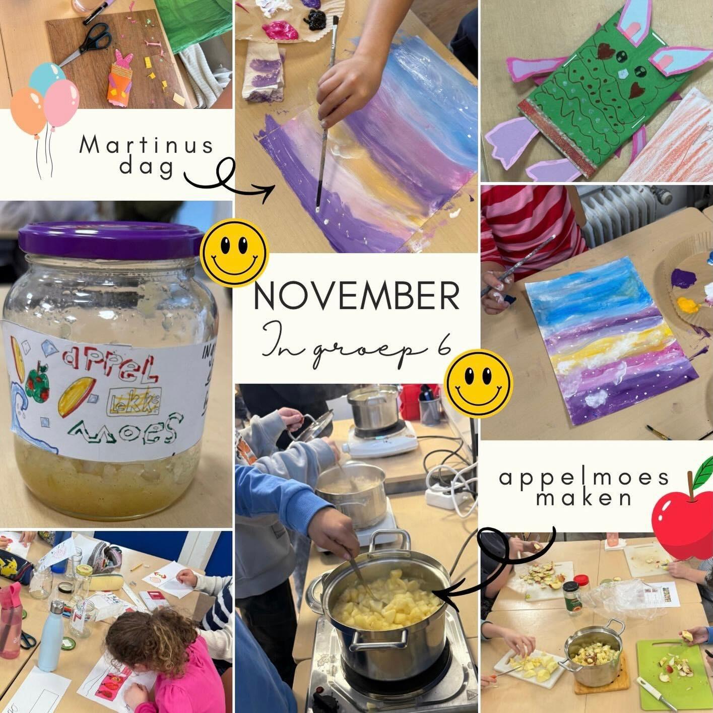 Deze maand hebben we in groep 6 hard gewerkt maar was er ook genoeg tijd voor leuke activiteiten! Zo waren er bij de Martinusdag verschillende workshops waar je kon dansen, schilderen of een Mexicaanse alebrije kon maken. Ook hebben we samen drie pannen appelmoes gemaakt van wel 4,5 kilo appels! Na het maken hebben we de appelmoes ook geproefd en kreeg iedereen zijn eigen potje appelmoes mee naar huis.